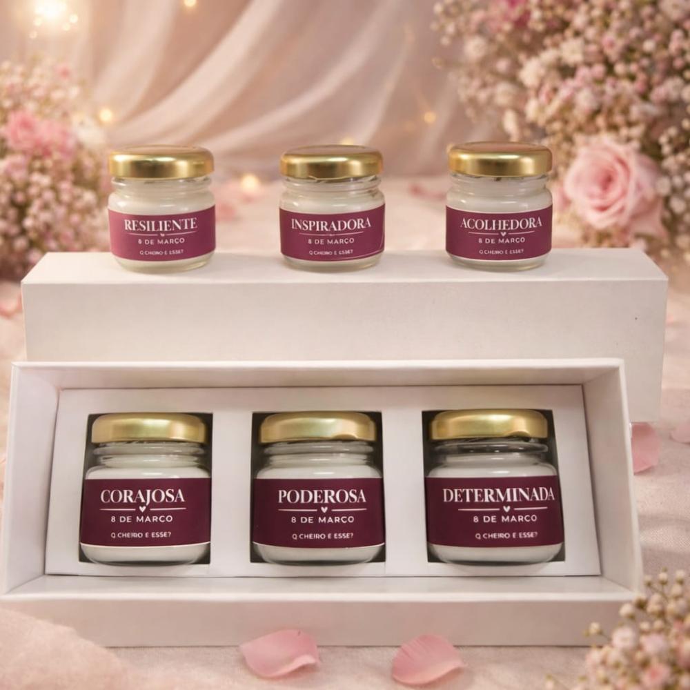 Um kit exclusivo com 3 mini velas aromáticas, embalado para emocionar em caixa presenteável.